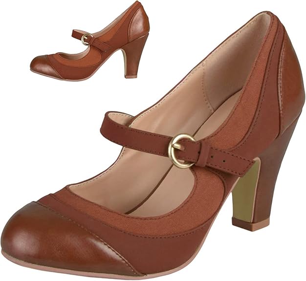 Women Kitten Heel Mary Jane Pumps Closed Round Toe Ankle Strap Patchwork Comfy 3” Mid Chunky Mary Jane Heels Cap Toe Two Tone