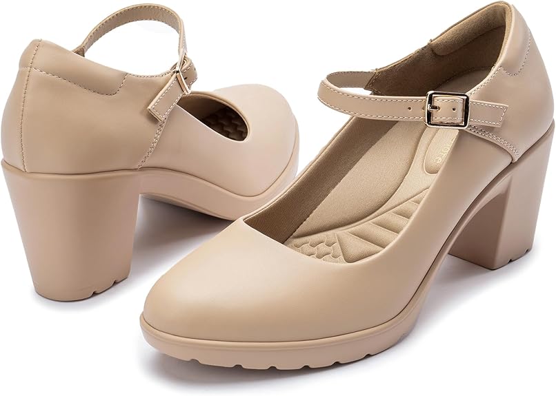Mary Jane Heels with Arch Support, Closed Round Toe Chunky Pumps for Women, Comfortable Block Heel Dress Shoes